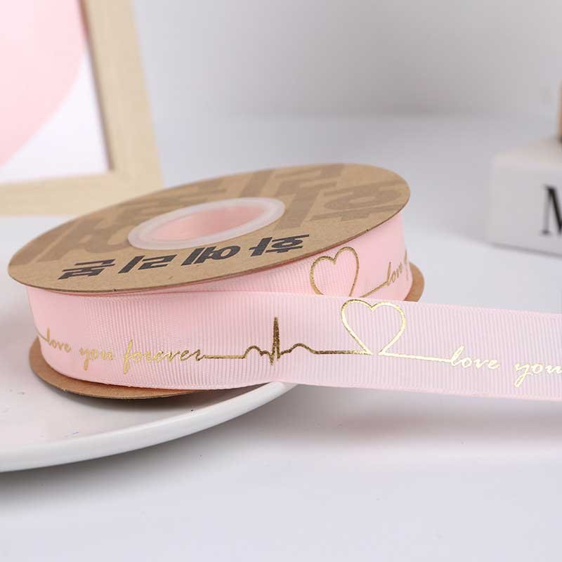 2.5 Double-sided ribbed webbing with gold foil stamping, heart shape patten, flower wrapping ribbon, Cake gift satin ribbon